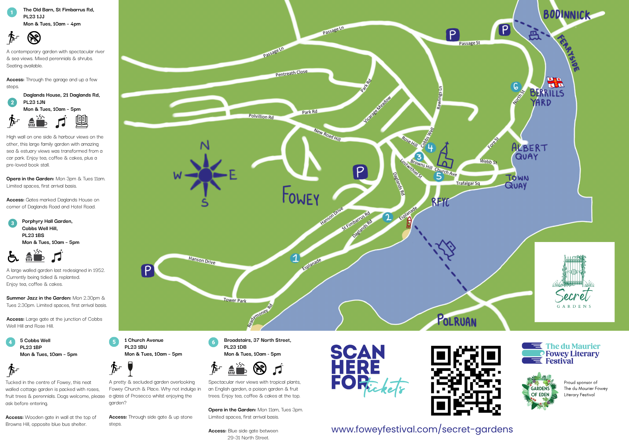 The Secret Gardens map and garden details will be available from the Festival box office, located in the Royal Fowey Yacht Club, during the Festival open days (May 2nd -9th). They will also be available at events during the Festival and at all participating gardens on May 25th and 26th.